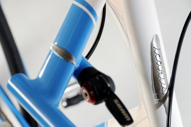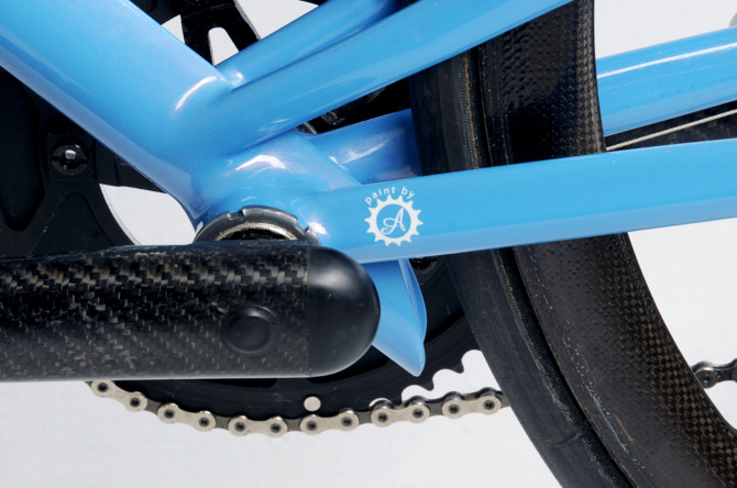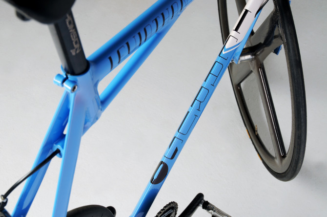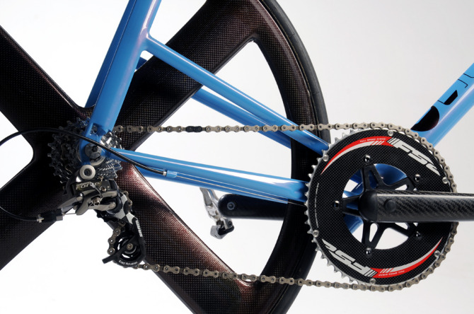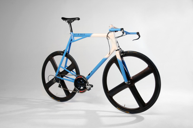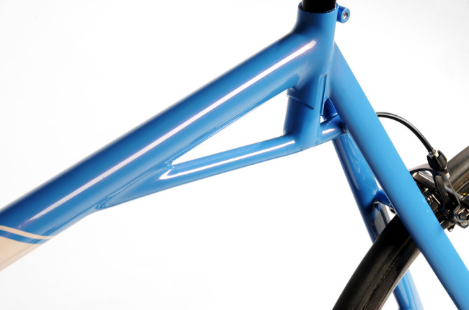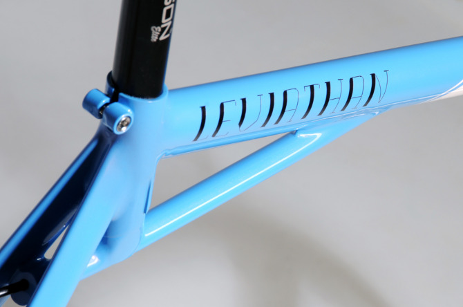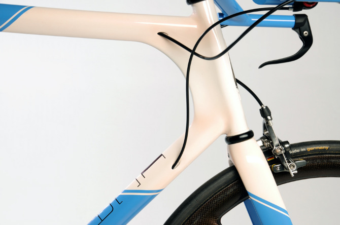 Some of the features are: internal cable routing, a missing seat tube, aero head tube joint, extended down tube, custom bar/stem combo.
